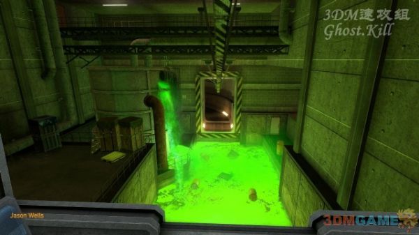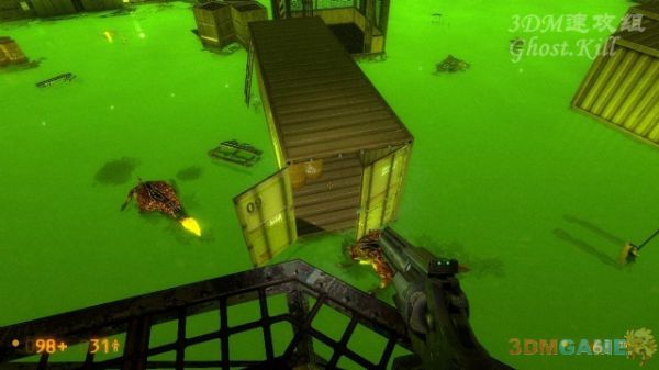 爬到一个有破口的管道中,从管道出来后上二楼,从喷出液体的管子上通过来到图中这个大厅,大厅中也是满是绿色液体,还是从官道上走,来到这个位置跳到下面的集装箱中,穿过集装箱进入电梯。