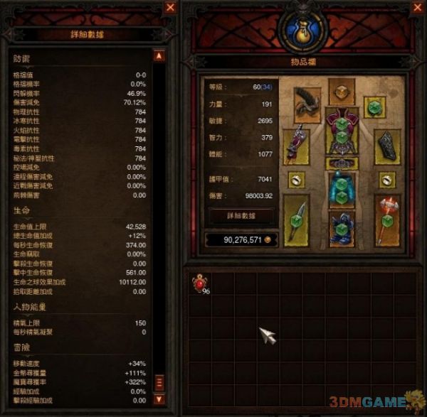 可以看到我在保证近10W伤害的同时还有大于700/7000的防御.大于4W的血量.34的跑速以及196的MF值(当然我这身的总价是超标的,但是不要MF的话肯定在10E以内)