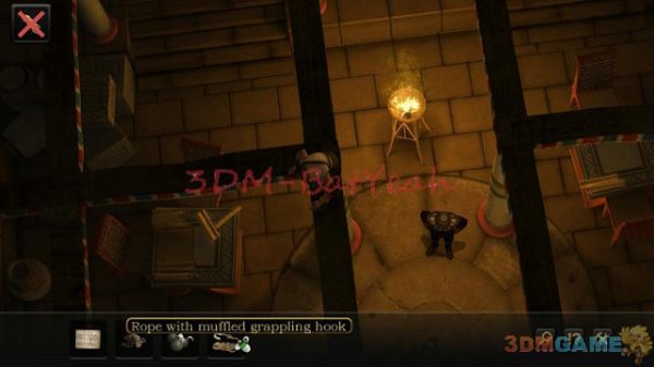 来到图书馆内部,此时玩家需要窃贼需要北部拿去亚麻布,之后于窃贼身上的钩子以及绳子组合,前往地图东部,将组合后的钩子挂上窗户之后进入到藏书室