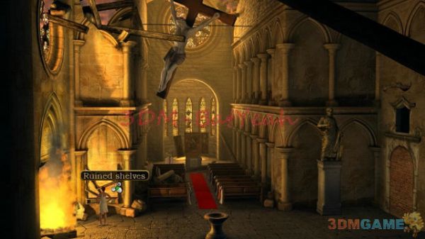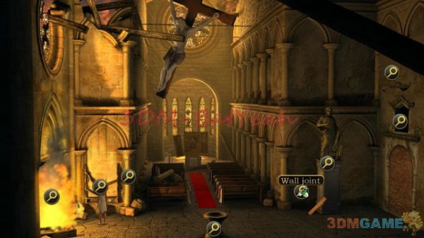 之后捡取教堂右部座位上的衣架在雕像左边的墙壁互动插出一条缝隙,之后将之前拿去的木板嵌入到里面组成平台;然后点击雕像即可登上雕像顶部