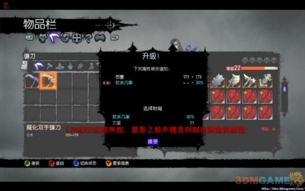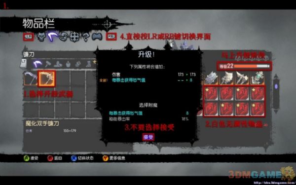 首先在献祭武器快升级的时候,选择新属性的时候不要接受,直接RB或者LB【键鼠用鼠标点击】即可重新献祭选择随机属性,这个方法比S/L大法又方便好多了。