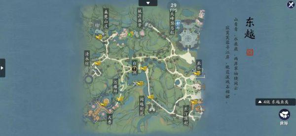 1、首先传送到东越地图,前往东越的桃源盛景左下角,寻找NPC;