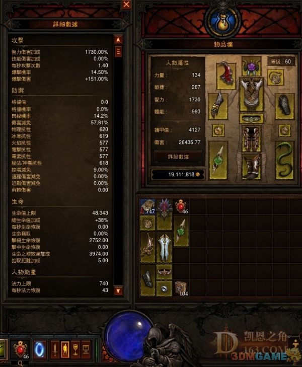 现在才开始入正题(不要扔鸡蛋。。。)现在我可以单刷全炼狱,尽量不死,今天还特意练习了一下杀大菠萝,比较烦,后面再说。最重要的是,绝对平民装,当然我现在买了一把还算可以的单手,其他部位基本就几十万,美服的价位。我的面板: