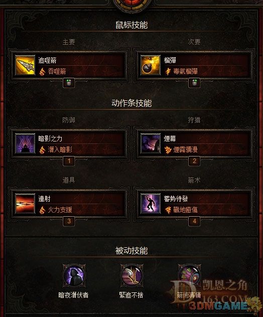 三个被动技能——箭术专精是加暴击率的,加暴击率是为了通过暗夜潜入者转化成戒律,这个大家一看就懂。第三个跑步技能,是因为没有其他需要的被动技能了,所以随便带了这个,跑起来快一点还是挺爽的。