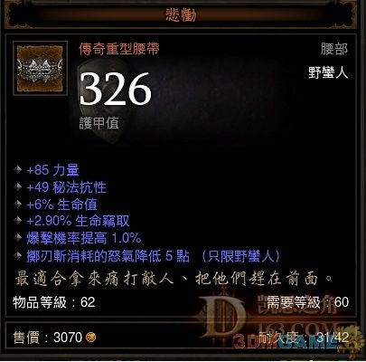 值得一提的是这个传奇腰带,个人非常喜欢,有必备的-5飞斧怒气,还有生命窃取和暴击,简直是专门为飞斧流设计的。