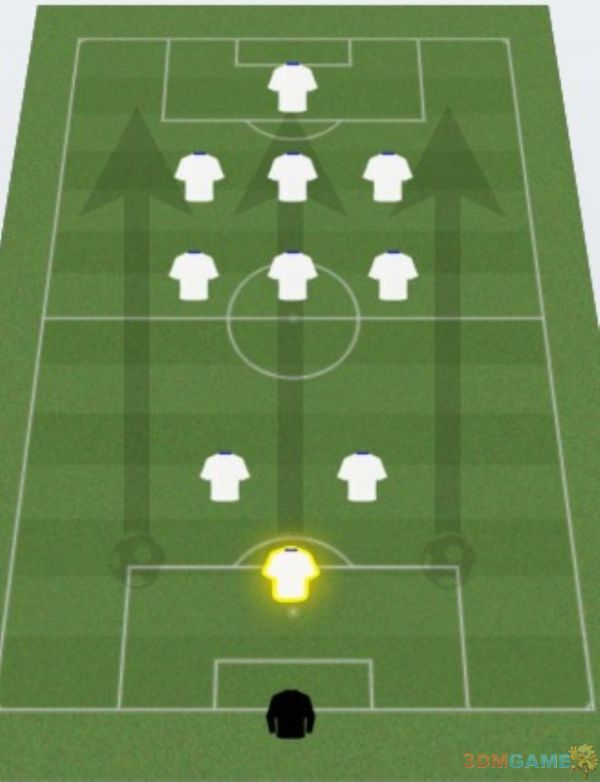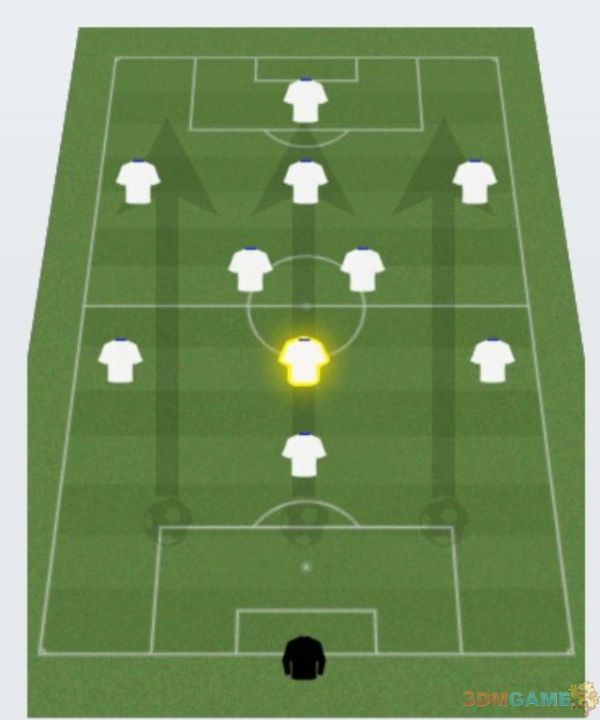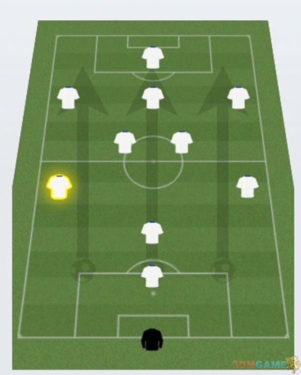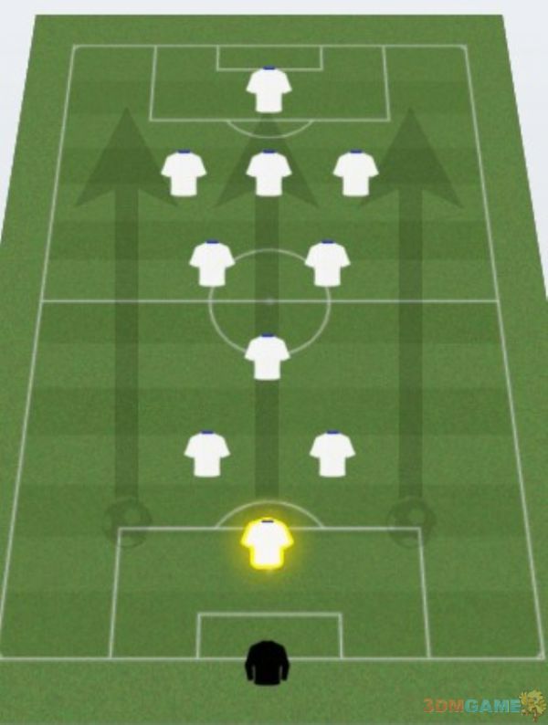 进攻变化2 保留一个后腰,稍微增强一下中场拦截能力,破坏对方反击节奏.对付比自己强,而且擅长快节奏反击的球队这么打比较好.虽然减弱了攻击力,但对方的反击更难打起来.