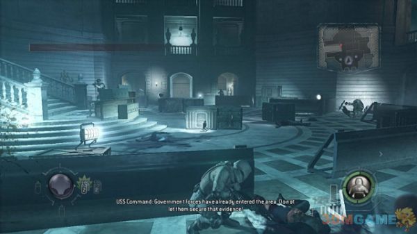 进入城市大厅,先借助掩体消灭中央的美国政府部队,防止他们收集证据,这里可以多扔几颗手雷炸飞这些家伙