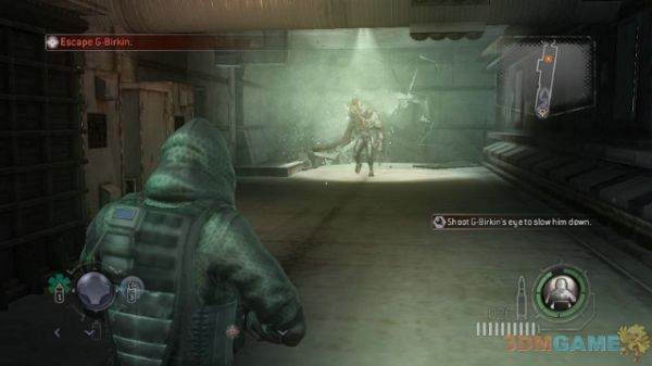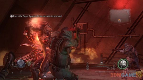 然后围绕着暴君射击他的头部。这是他唯一的弱点。注意要围绕着暴君转圈移动攻击,不然在如此狭小的空间你是肯定要被击倒的