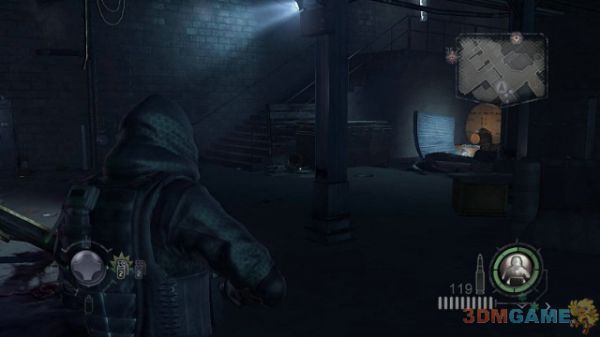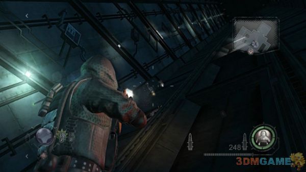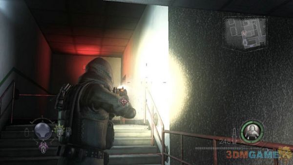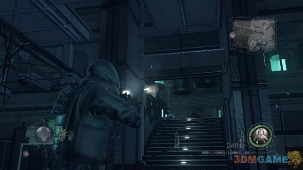 沿着楼梯向下一直前进,会再次遇到三波左右的UBCS部队,战斗难度不是很大,多利用掩体即可,保持居高临下的射击站位。这里还需要注意的是在该场景下,你的身后可能会出现敌人,保持小心前进为妙。按Q可以切换到近战模式砍杀敌人,但杀伤力一般。建议近战用手枪直接对轰