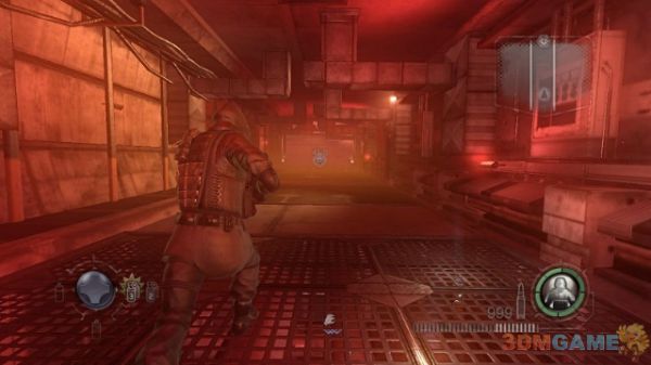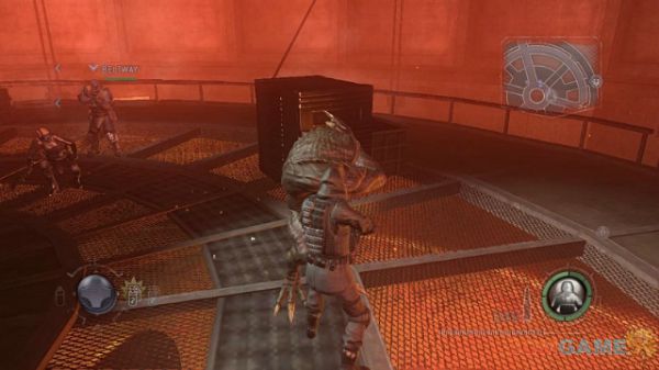 下面就是本关的难点也是最出彩地方,G-1追逐战。这里只有一个要点,那就是跑;别指望你能击中他右臂的那个大眼睛。每个场景都要按SHIFT加速跑到门前迅速打开。有的门可能需要等待10秒左右,所以你需要的是蹲在门口不管什么弹药都倾斜到G-1身上