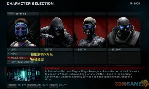 首先进入剧情,1998年 死神HUNK将会带领你的安布雷拉安全小队 ,侵入Birkin博士的实验室抢夺G病毒的样本。