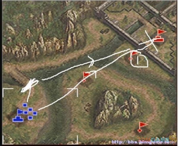 进攻路线为最快占领全点,因我军兵力大优,兵种组合齐全,孙军选择龟城并没有开伏兵出来。等到双能量满时贴右侧城墙攻城,孙军开启伏兵,但是是从城墙下射,挺到守军都上城墙后4个大打击,击溃大部分,迅速撤退,下一轮时直接枪兵防御+攻城强化+大打击强行破城,GG