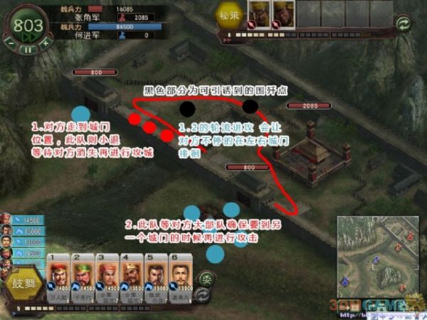 进去之后如三城门皆破,则可四点任意引诱围歼,如只破二门,那么就在右门留下一队,其余支援左门的围歼,围歼点为左侧空地和右侧的空地。