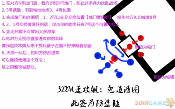 上面所说的可以参照我的渣图,至于交换方式可以查看攻城部分:1号先动,走出10号范围之后回去攻城,2号小移,在开启部分城门【不影响堵门效果】的情况下脱离10号范围,那么10号和9号合流,就很好引诱了。