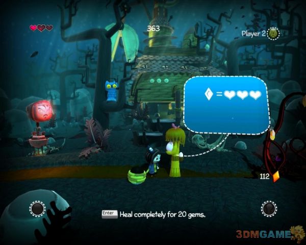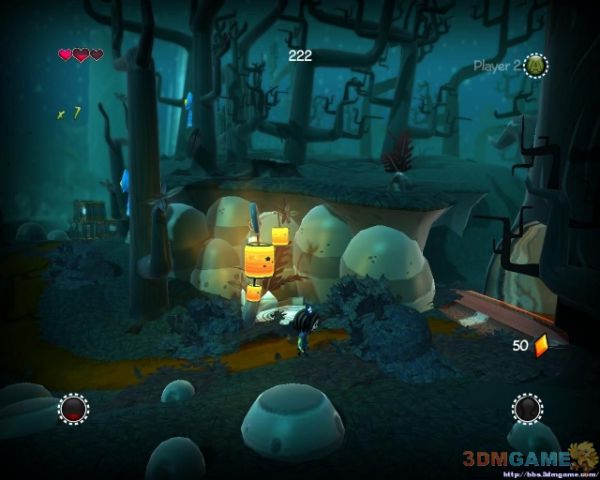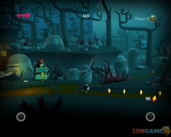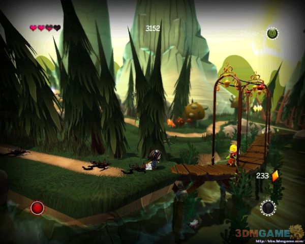 清理掉敌人来到商店处购买所需技能(物品)继续前进.来到岔路口从下路前进(会遇到三只山羊)到前方平台将飞行敌人击杀后继续前进(从左侧反转的平台飞行前进到右方会有血条奖励),解决一些敌人来到新的NPC处同样的可以给它晶体给你恢复血.通过大门后要小心天上的鸟空投敌人下来(此时最好是能有能力开启恐怖模式),清理掉一些藤蔓来到叉路口(会遭遇一只山羊敌人)从上方继续前进
