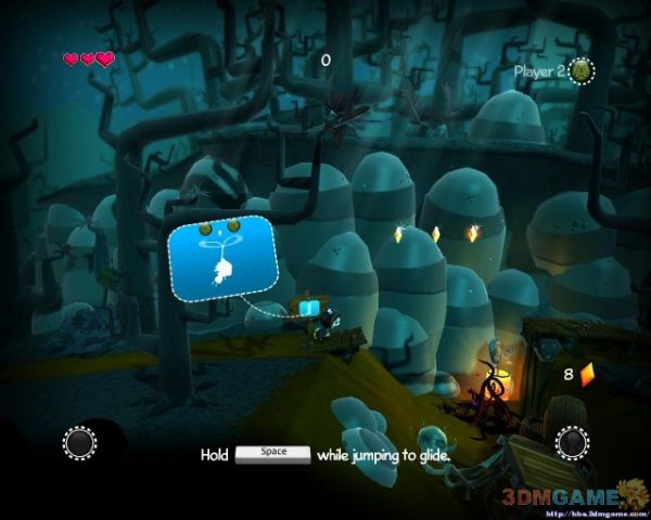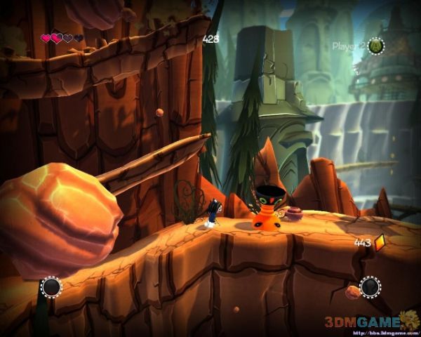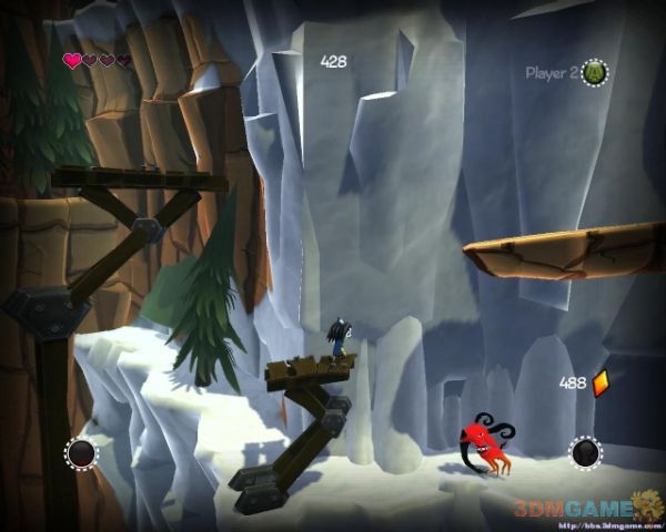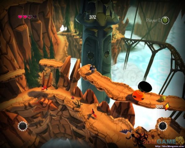 避免掉下去遭遇敌人从树木上通过到对面,下来后会遭遇一定数量的敌人(可以走上方平台尽量避免战斗).会翻滚那个弹跳床是敌人(不要以为长个萌就无害)在桥上会遇到新NPC恢复你的生命,翻滚过岩石后前方会有弹跳床,待它翻滚过来后跳上去可弹跳起来.前进一段之后会有大量的岩石从上方掉落但只不要上去就砸不到