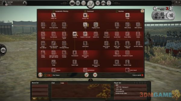 技能树类似魔兽的天赋,有三种类型技能,分别是枪术、(将军卫队可用左轮射击)、指挥(可呼叫舰炮轰炸敌军)和格斗,随着玩家经验值的提升可以不断获得技能点数,当然你不可能全部学满,如果要洗点需要花费“家族币”。