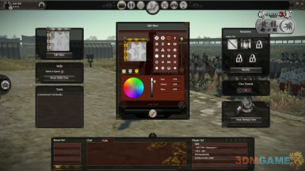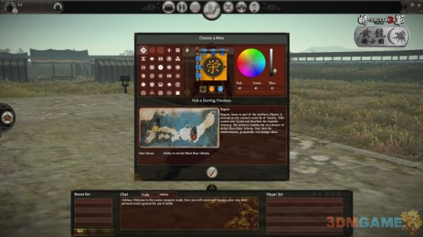 进入游戏首先要编辑一个玩家您自己的家纹,选择一个家纹图案,然后可以改变图案底色、旗帜底色和旗杆贴片颜色。