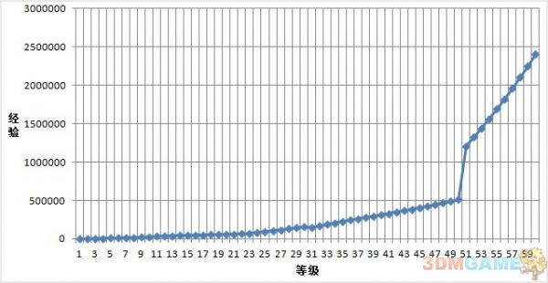 上面是一张由玩家根据下面列表整理出来的趋势图,我们可以很明显的看到,在50级开始,有一个明显的经验值提升曲线,玩家每次升级将需要获得更多的经验值。根据之前的信息,50级应该是角色准备进入地狱难度的级别,说明这时候的战斗会更加复杂,难度陡然提升,精英怪物应该会更加密集,地狱难度将消耗掉玩家更多的时间。