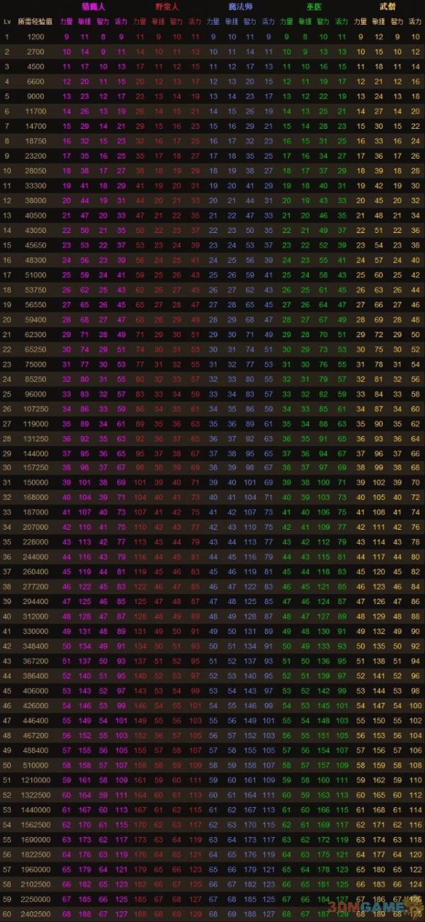 与等级相关的另一个变化是角色属性,暗黑3中角色属性将采用自动分配的方式增长,所以所有角色在每个等级的基础属性是固定的。下面的列表中包含了五种角色1-60级各级所需的经验值及基础属性列表。