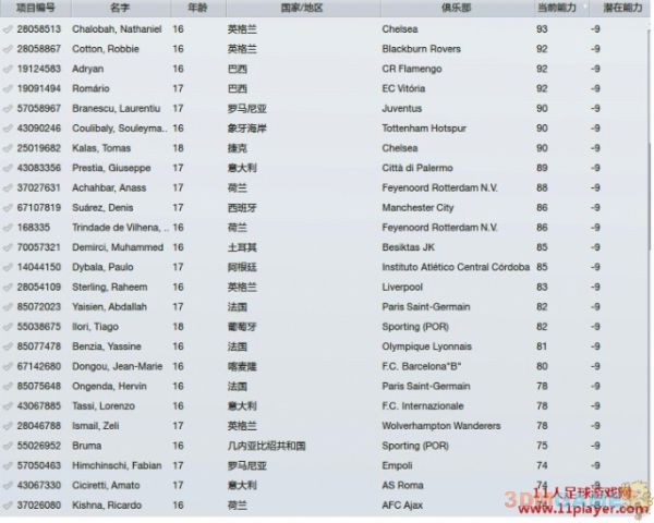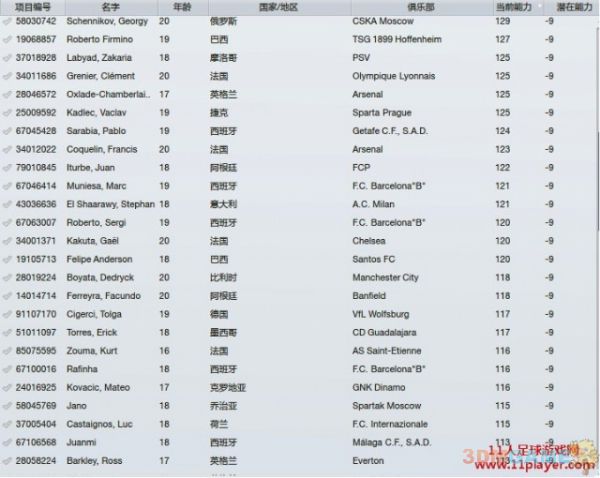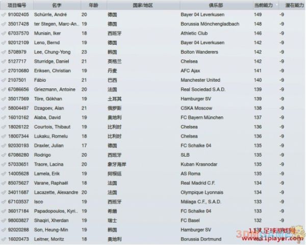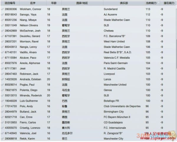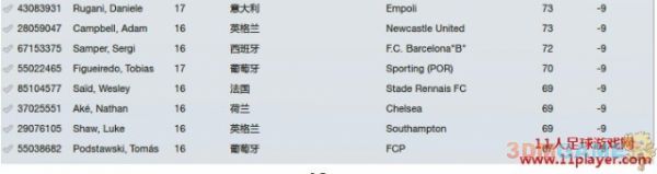 比较意外的时没有-10的球员(早前版本唯一的-10球员拉姆塞,已经变成固潜175 ),以下是-9的球员名单(共108名)