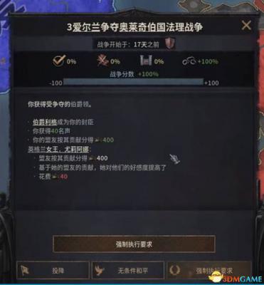 关于战争最后的结果,需要我们完成三种事件之一,分别是投降,无条件和平,强制执行要求。