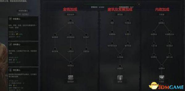 管理方面,三个分支分别侧重金钱、建筑、内政。