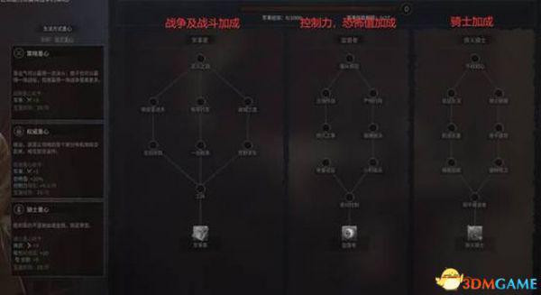 战争方面,三个分支侧重点分别为战争与战斗、控制力与恐怖值、骑士和吸引力。