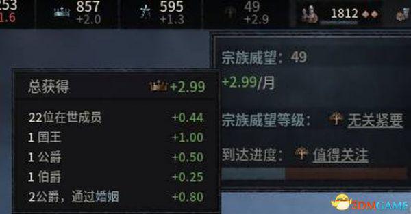 游戏中宗族威望的提升取决于宗族中统治者的数量,和其他统治者配偶的数量。