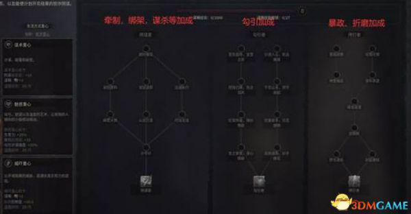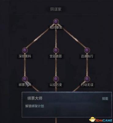 然后首先发展谋略重心并点出绑票大师技能(绑票即用计谋将对方囚禁)。
