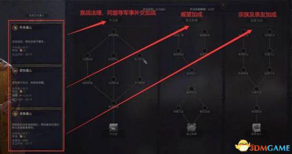 首先是外交,三个分支分别加强国家外交、威望、宗族内部外交。