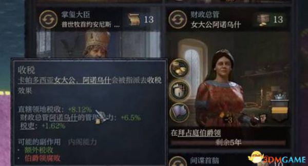 财政总管的关键属性是管理,第一项事务收税属于被动技能,直接增加直辖领地的税收。