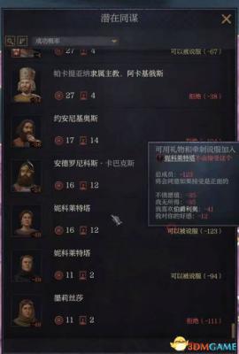 邀请同谋界面可以查看每个潜在同谋对密谋成功率和强度的加成,同时是否会接受我们的提议。