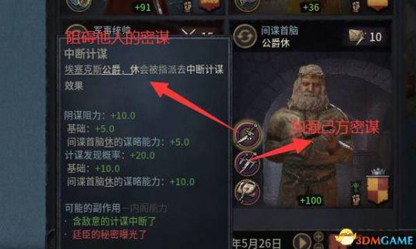 间谍首脑的关键能力值为谋略,前两个技能属于被动技能,分别能阻碍他人的密谋或者强化我们自己的密谋。