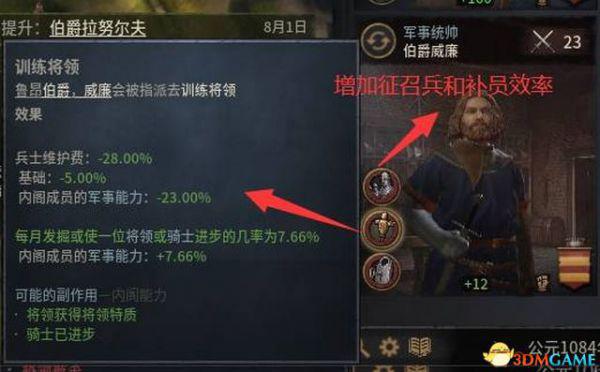 军事统帅的主要属性是军事,前两个属于被动技能,分别提升军队规模和将领增益。