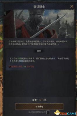 如果需要招募额外的骑士可以执行决议邀请骑士,花费150威望并在几个月内邀请3名骑士作为宾客。