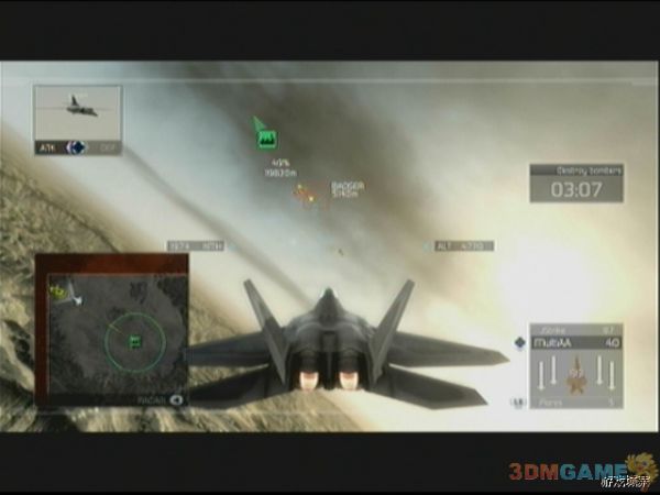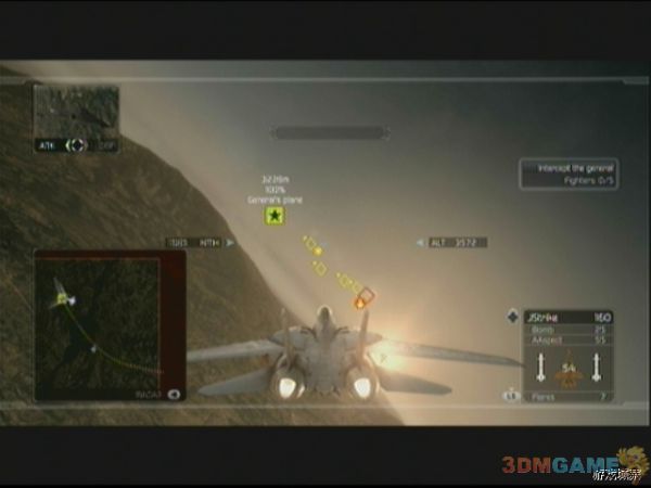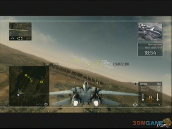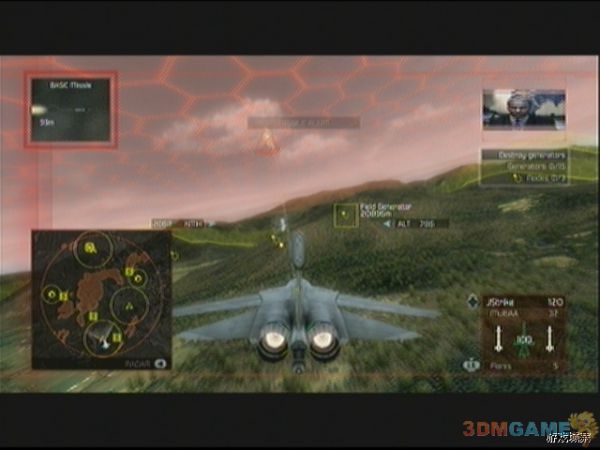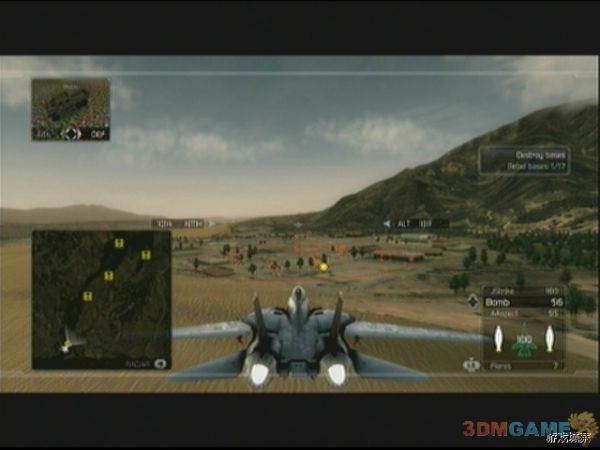 任务开始后,按照地图提示的路线飞行即可,一会儿会提示出现任务,只要按方向键‘下’切换到外挂副武器炸弹即可,前进一会后,地图上会出现敌人的仓库标志,飞过去后,用副武器炸弹的瞄准圈,尽可能多的圈进去些敌人的仓库以节省弹药,然后炸毁即可。出现新任务提示后,同理飞过去一路轰炸,之后进入20分钟倒计时,玩家要在倒计前完毕前轰炸完17个敌人地面基地,敌人会有F-5E前来支援,F-5E较前两关遇到的敌机要难对付不少,玩家需要有一定的追尾技术才行,建议优先击破F-5E后再专心轰炸基地。轰炸完毕后,任务更新,要在将军的飞机飞到目的地前摧毁其周围的护卫机,注意摧毁将军的飞机任务会失败的,摧毁后任务3完成。