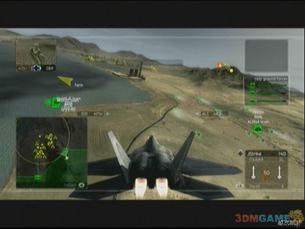 一上来就是漫天的飞机大混战,敌机种类也有很多,将僚机的状态调整为攻击,然后狠狠打吧,注意躲避导弹即可,战斗一段时间后,敌军空投坦克,倒计时开始,玩家需要保护绿色范围内的地方,对地面的坦克和空中的CARGO展开攻击吧,如果能多击破一些敌军运输机,对玩家将会带来不小的帮助。待倒计时结束,我方支援部队赶到,开始和我军一起清除敌人,敌人全灭后,任务顺利完成。