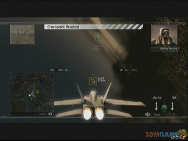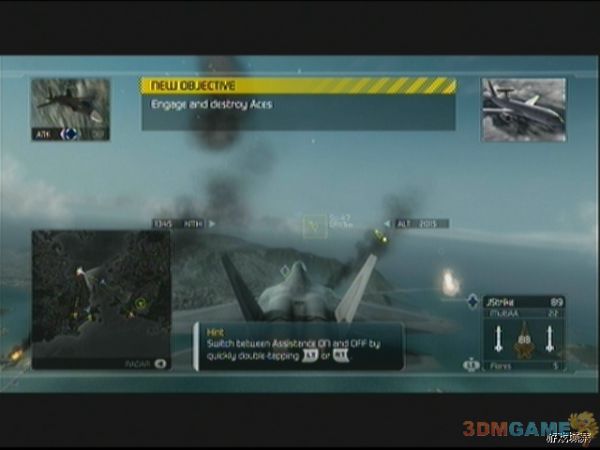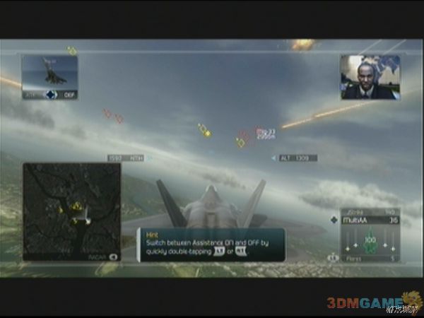 任务1为上手任务,游戏中会不断给予玩家提示进行各种操作,玩家可以借此任务熟悉游戏的操控方法。任务方面,开始后首先往南边一直飞,等待目标在战术小地图出现后,清理即可。几轮攻击过后,地面的AA对空炮和坦克被清理完毕,任务更新为保护幽灵小队,战术地图上的绿色骷髅标志就是幽灵小队,玩家需要来回盘旋在幽灵小队的前进路线上,攻击地面目标保护小队,AH-64直升机也会来攻击小队,都很容易对付。之后任务进入第三阶段,玩家要面对的是若干架敌人的Su-27“侧卫”,只要在敌人机体后边做好追尾,及时锁定,即可顺利击破,注意玩家自己如果被锁定后要及时摆脱。击败Su-27后任务1顺利完成。
