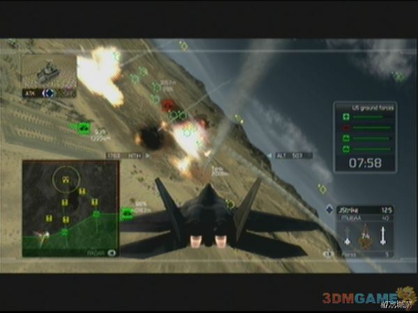 任务开始后飞行一段时间,会到达敌人火力范围,并会出现蓝色的ERS下载条,完毕后出现,ERS通道,玩家必须沿着ERS通道进入敌人火力范围内部,才能不被敌人的炮火攻击到,ERS会领着玩家到达第1个敌人的防御据点,摧毁后沿着ERS出敌人火力范围,会进行第2条下载,完毕后要靠近附近绿色的目标,才可以按X开启通道。这里高速穿梭在敌人炮火中的感觉还是非常刺激的,摧毁全部3处目标后任务更新。支援地面部队,敌人目标非常密集,如果玩家外挂武器有炸弹的话,大可飞到高出玩一次轰炸机高空轰炸。全灭敌人后任务结束。