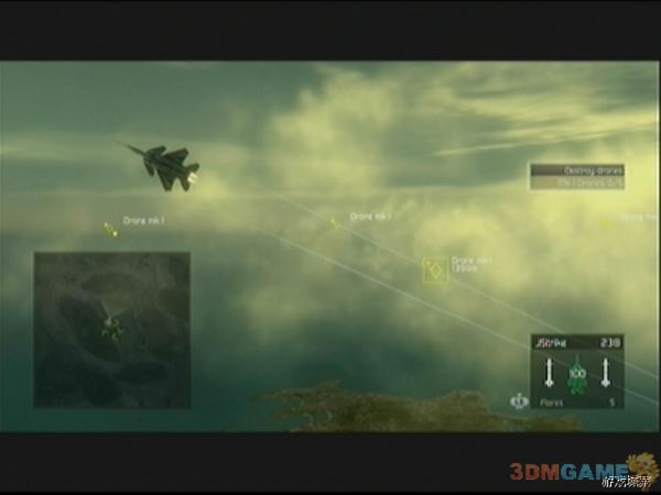 任务开始后,首先爬升到3000米之上,然后连点RT或者LT进行远视点的切换,之后任务更新,按住LT减速,直到飞机失速,之后迅速按RT重新加速即可。玩家需要用这种远视角模式先后摧毁几处静止和移动的无人机,注意会移动的无人机会跟在玩家后边,玩家应该利用减速来减小盘旋半径,从而令机头迅速指向目标,再加以锁定。最后出现3架会发射导弹的无人机,同样合理运用减速和失速让敌人机体处于前方后击毁,任务5顺利完成。