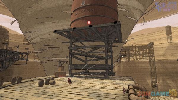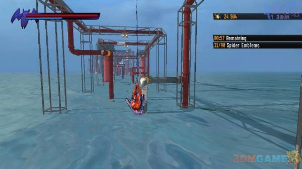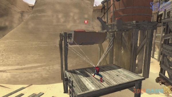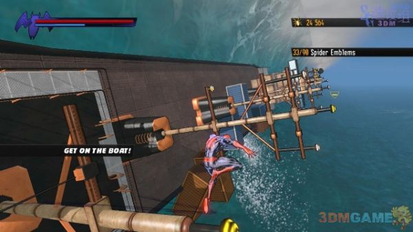 等被掀翻的轮船到我们面前后利用蛛丝跳上去前进到论坛的尾部,然后从尾部上到另一个平台的集装箱上。