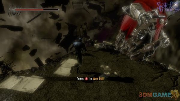 来到楼顶后按十字键上键找到碎片位置,不过被废墟挡住了,按B用蛛丝抓住石块吗,连续按B破坏石块,得到碎片。