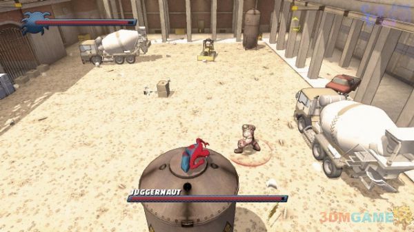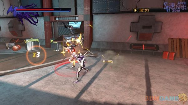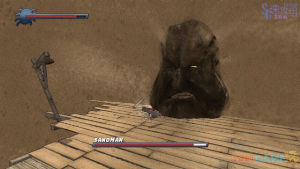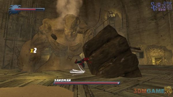 我们不能直接攻击他,对准地上的箱子什么的按B用蛛丝抓起来后按X砸BOSS,砸到他之后他会放导弹,