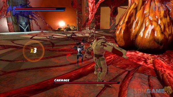 接下来使用黑衣蜘蛛侠,无双模式的怪物,等BOSS放出光球来,当光球是红色的时候不能打,