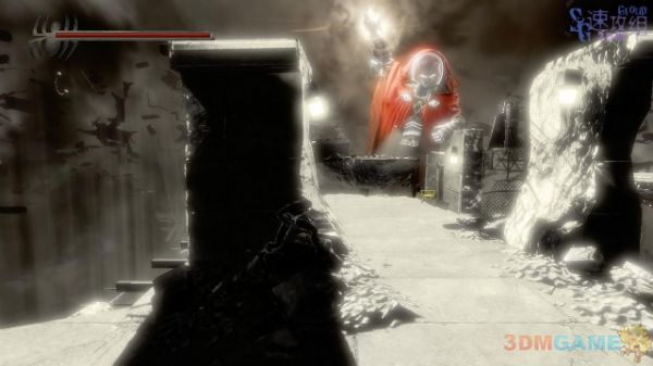 我们躲到机器后边让他把机器打爆后房间里会充满烟雾,这时候我们跳到二层切换视觉模式观察BOSS动向,