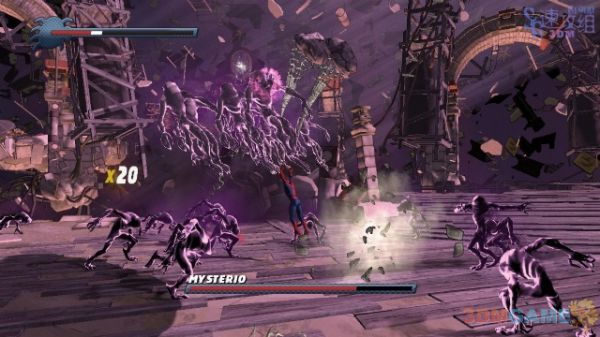 使用现代蜘蛛侠,荡秋千到前边的平台上,平台上有冒着紫色烟雾的石块,到达后地上会出来很多敌人,