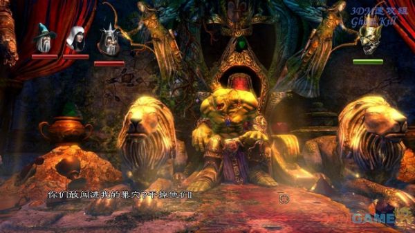 到上层后一直向右走,不要停下,刚上来几秒钟这就开始喷火了。先用法师移动右边的喷火口,随便什么位置,只要烧不到摇杆处就可以了。然后换成勇士过去拉摇杆,左边有个旋转的喷火口,等转到摇杆位置的时候用盾牌防守就可以,然后继续拉摇杆,开门后出去。