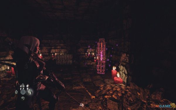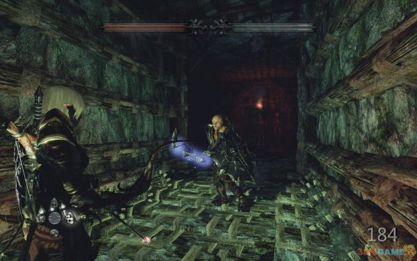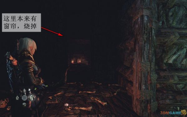 在通道的左手边的左手的墙上有个机关,拉下来通道的那个机关就可以固定住了。然后用点燃的箭烧掉墙上的窗帘就可以看见,我是第二次无意中发现的。