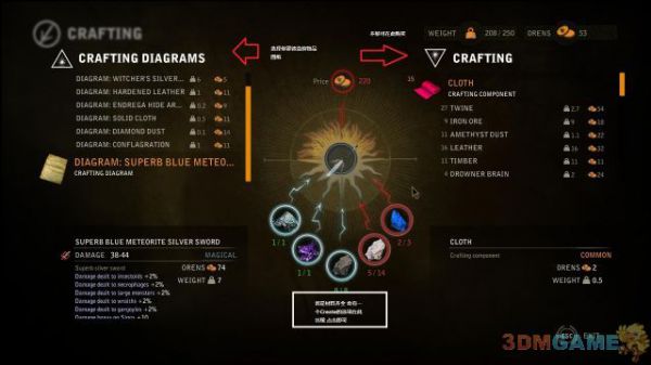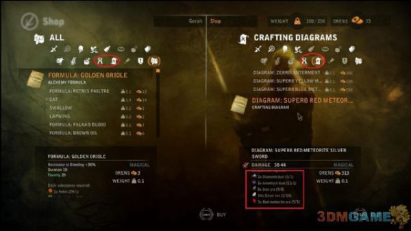 注意红色标注地方 圆圈内 左侧为原料 右侧为图纸 方框类为需要材料~ 毕竟都很贵。。。俺木有修改器~~